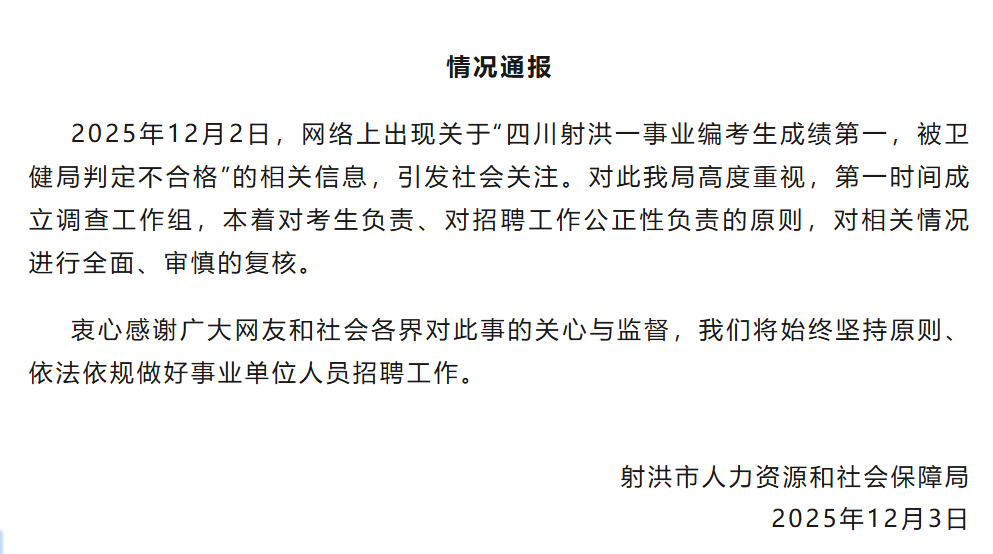 2025年12月2日,网络上出现关于“四川射洪一事业编考生成绩**,被卫健局判定不合格”的相关信息,引发社会关注。